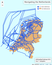 2023 Dag 7 was mijn allereerste bijdrage. Het thema is Navigation en ik heb gekozen voor het weergeven van de hoofdvaarroutes in Nederland. Klik op de afbeelding voor de online versie, of ga naar de