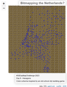 Na de eerste MapChallenge kaart kon ik natuurlijk niet stoppen. Elke dag een kaart gaat niet lukken, maar sommige thema's triggeren iets. Zoals dag 9 Hexagonen. Dat associeer ik met raster-data en ik ben niet zo goed met raster data. Dus ben ik vectordata gaan stylen in de vorm van hexagonen. Gewoon, omdat het kan.