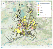 RondomIsoleren is een bedrijf in Utrecht dat onder andere vloerisolaties uitvoert met duurzame materialen. Zij willen graag laten zien waar ze dat werk uitvoeren, zonder natuurlijk privacy-gevoelige data online te zetten. Ook hier kan een heel eenvoudig kaartje een mooie oplossing bieden. In deze kaart heb ik hun data geaggregeerd naar CBS-buurtniveau. Voor de herkenbaarheid heb ik een achtergrondkaart van OpenStreetMap gebruikt.